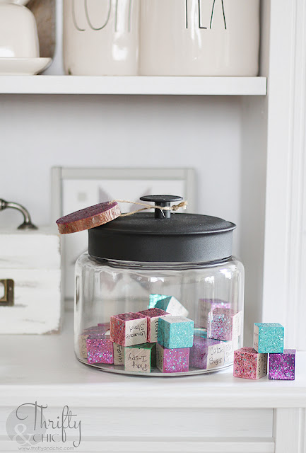 I then wrote something fun to do on each one. On the opposite side of some I wrote a chore, or another fun item. I figured when they pick one out of the jar, they can then "roll the dice" kind of thing. Or, they need to do the chore before they do the fun thing! If they get a block with two fun things, then yay for them! :)